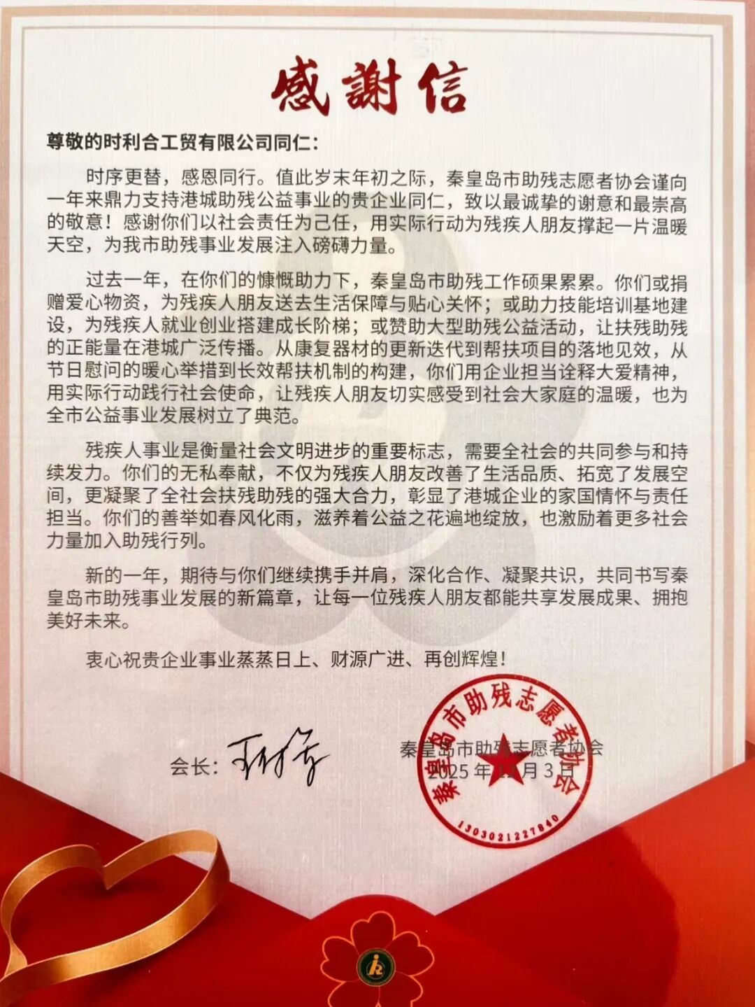 12月3日,秦皇島市“秦心共融 益起歡歌”世界殘疾人日公益聯(lián)歡會(huì)順利舉辦。我司董事長(zhǎng)、秦皇島市助殘志愿者協(xié)會(huì)會(huì)長(zhǎng)王付軍全程參與,和各界愛(ài)心人士一起為殘障群體發(fā)聲,助力助殘事業(yè)。